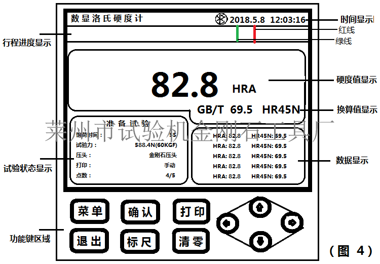 近年來,由于數顯洛氏硬度計測試精度高、無人為讀數誤差等優點,越來越受到企業用戶的青睞,我廠生產的這款數顯洛氏硬度計較之以往市場的數顯洛氏硬度計的優勢在于:1.采用高精度傳感器與精度萊金品牌金剛石壓頭(壓頭精度為標準級),確保儀器精度;2.可選配洛氏的其他標尺;3.內置軟件可對儀器進行±3HR的補償;4.可自動轉化為其他標尺硬度值?,F在就使用者較為關心的數顯洛氏硬度計屏幕主要功能鍵做下簡單介紹,若有進一步了解的客戶可致電萊州市試驗機金剛石工具廠技術科:0535-2215886。